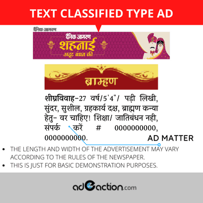 Display ads and classified text ads are completely different than each other. Dainik Jagran Classified Text ads are mostly a basic form of advertising. But the bigger advertisements are called display ads. So basically if you publish any classified text ads in the newspaper that will be on a separate page and category like - Matrimonial. You can not manipulate the page/position of the ad by paying extra. But if you want you can manipulate the page and position of your newspaper display advertisement.