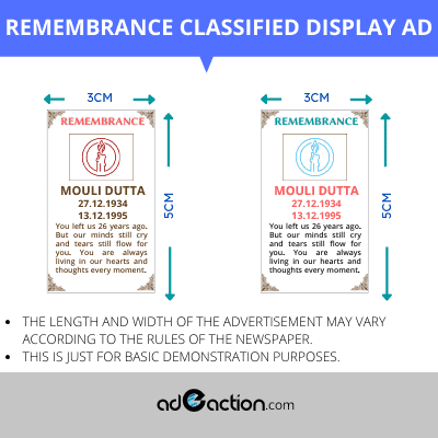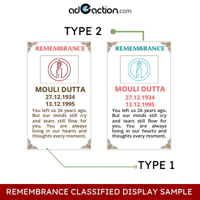 Remembrance Classified display ads are one of the most loved advertising formats. It allows you to add colours, fonts, and images to it. So it can make a good advertisement deal under classified display ads. Booknewad offers the lowest rates for newspaper advertising.